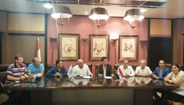 السيد نقيب الفنانين والسيد مدير عام مشفى الأسد الجامعي الدكتور نزار عباس يوقعان العقد الخاص بمعالجة الزملاء أعضاء النقابة وعائلاتهم، بحضور الزملاء من مجلس النقابة المركزي وفرع دمشق.